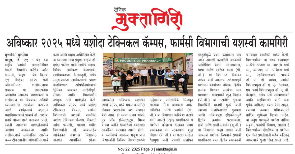 यशोदा’ चे डी. फार्मसी विभागास एम.एस.बी.टी.ई कडुन ‘एक्सलेंट’ ग्रेड प्रदान