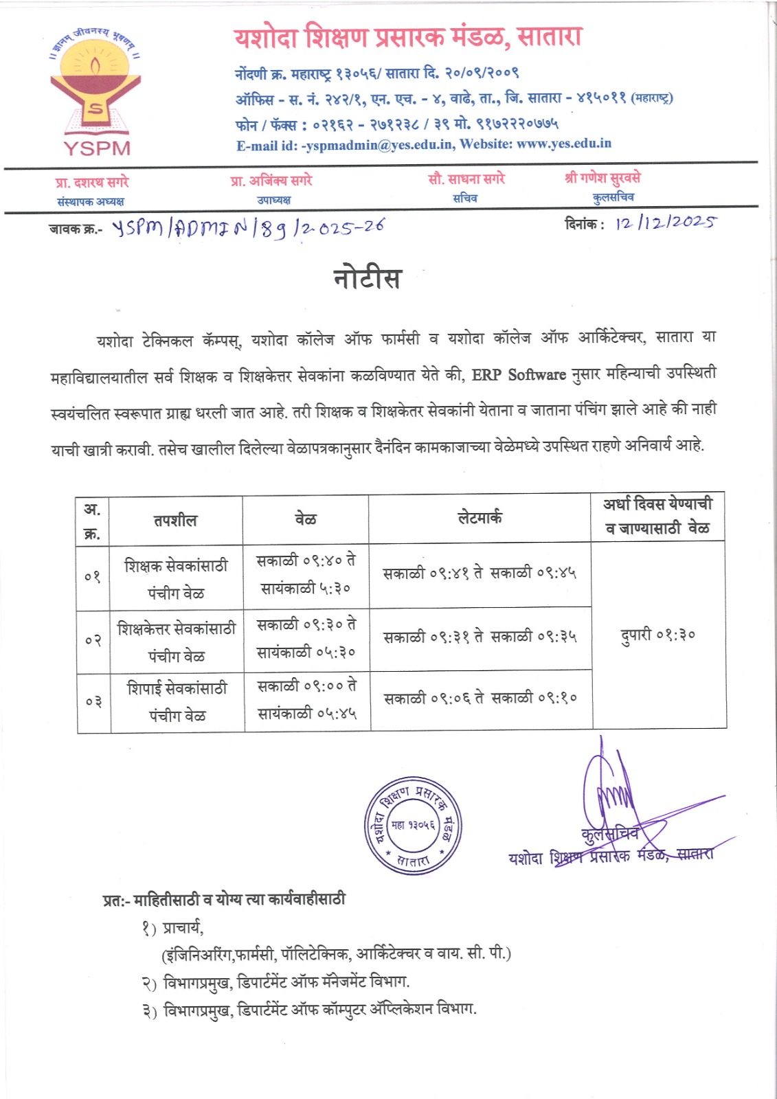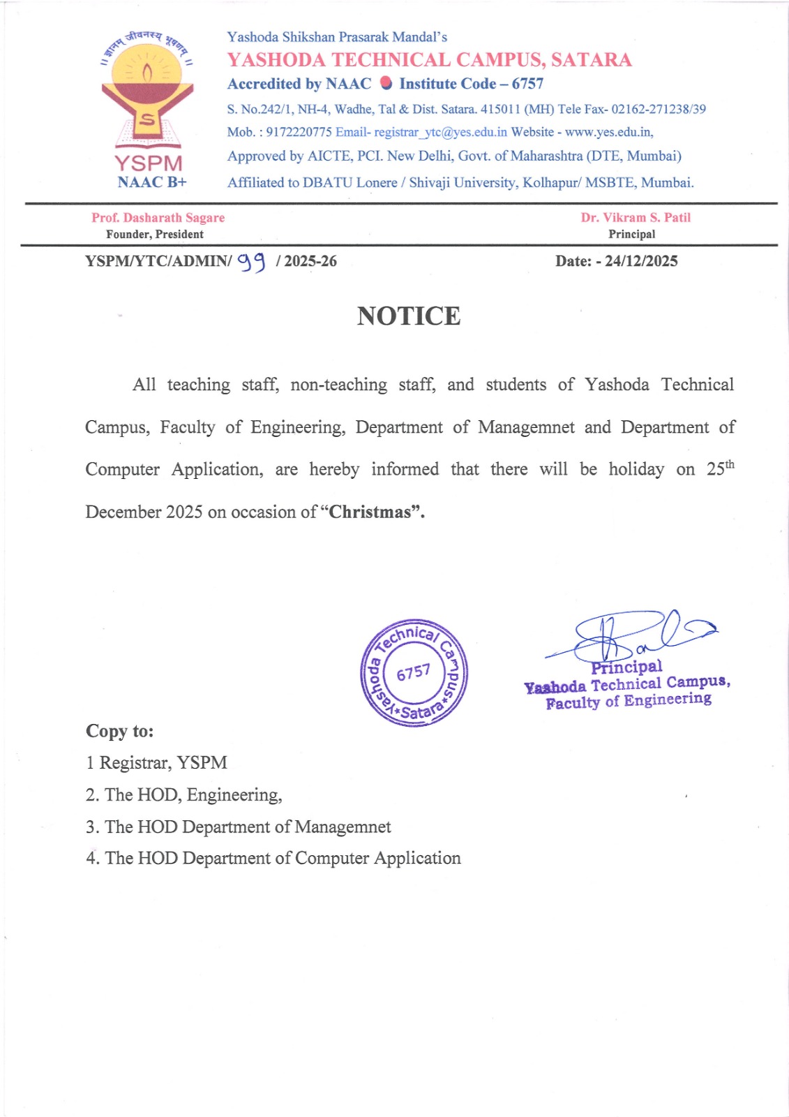 नोटीस सर्व शिक्षक Engineering MBA - MCA रविवार दिनाक ०३.०८.२०२५ रोजी महाविद्यालयात दैनंदिन कामकाज सुरु असल्याबाबत |