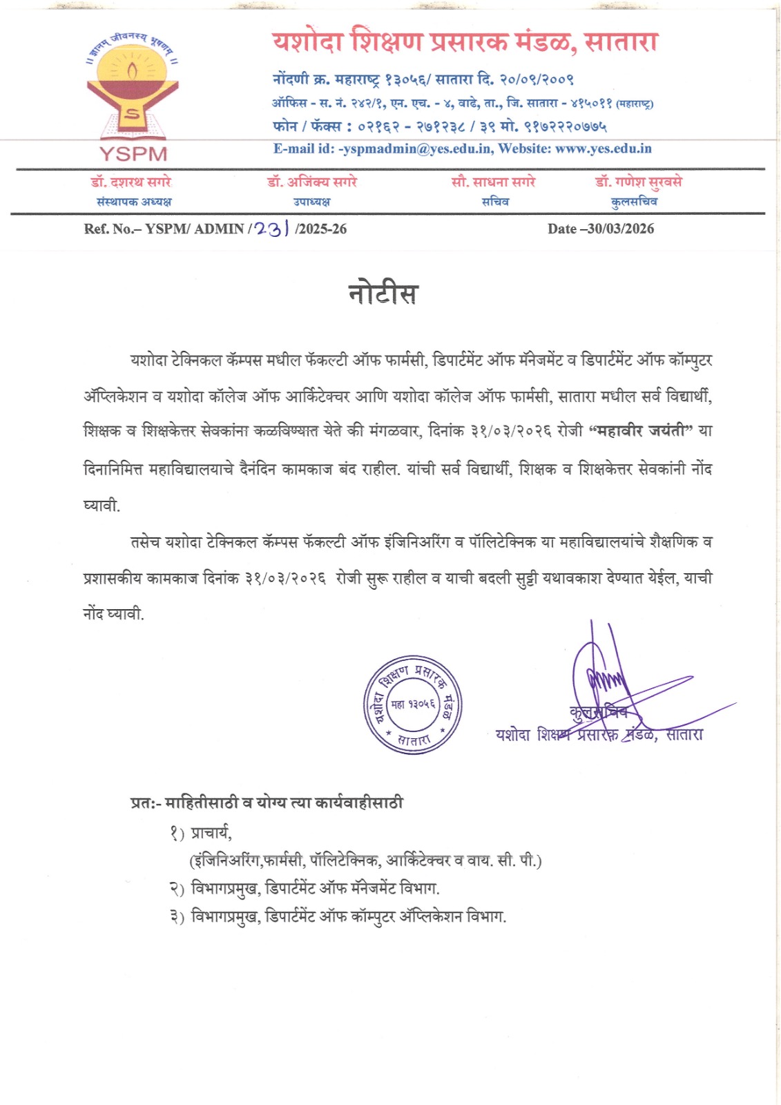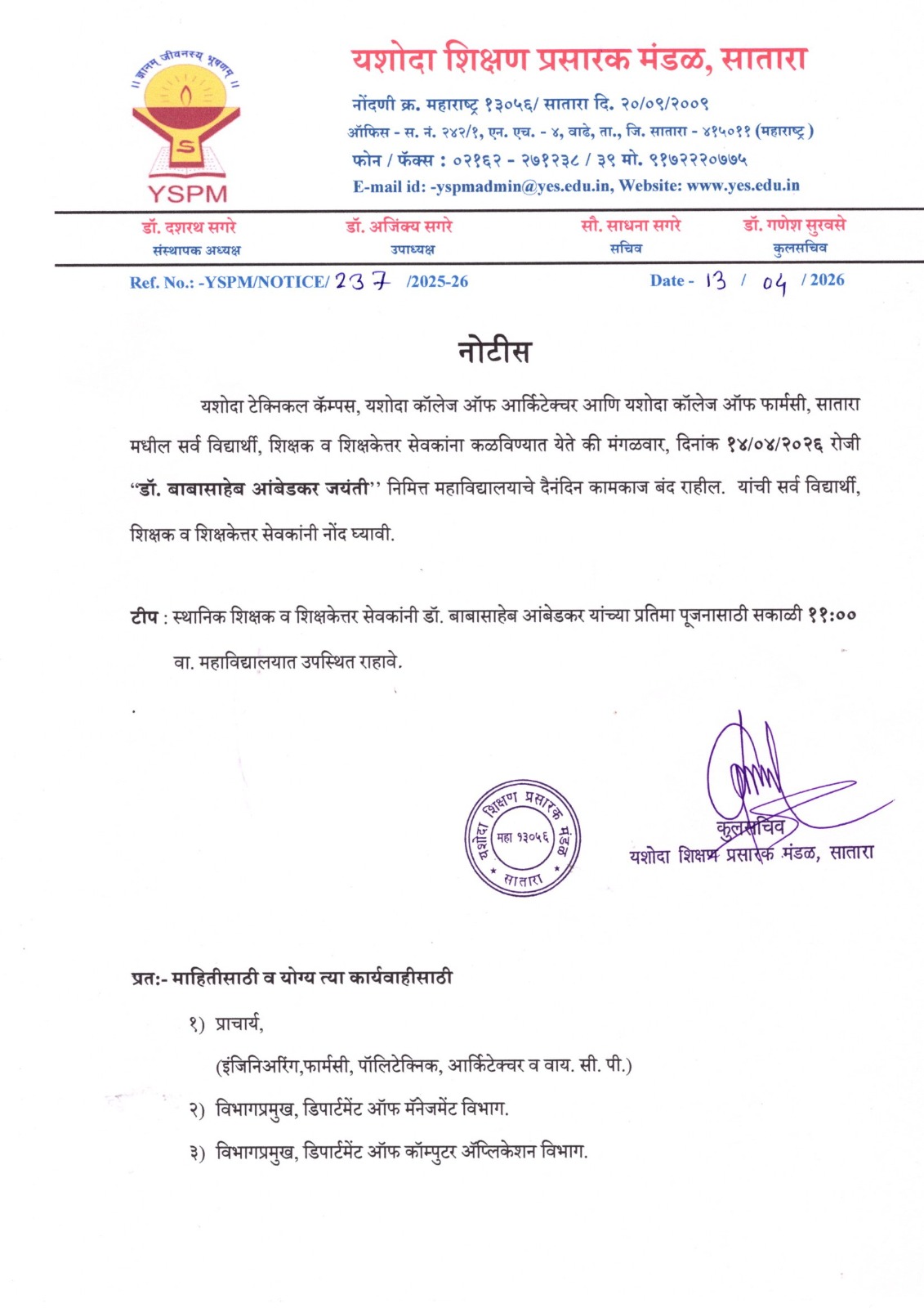 महाविद्यायास २६ जुलै रोजी सुट्टी राहील |