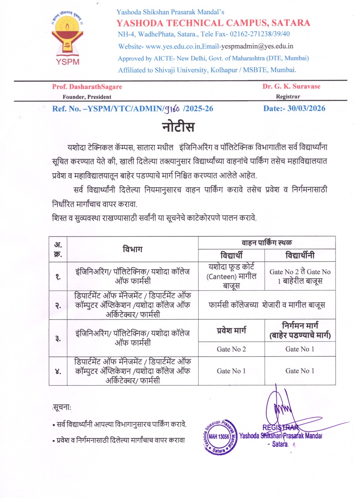 नोटीस - विद्यार्थ्यांच्या वाहनांच्या पार्किंग बाबत.. |