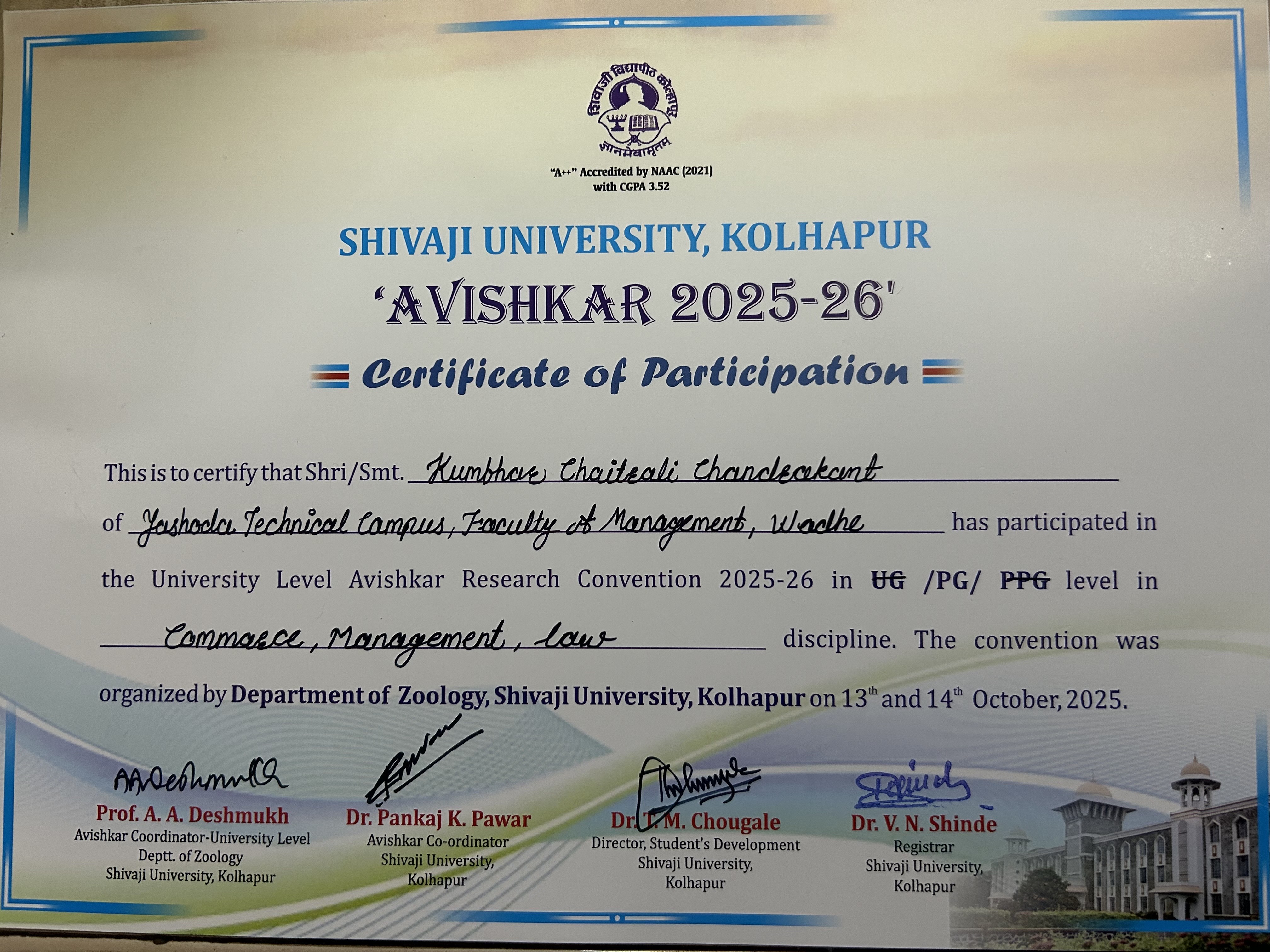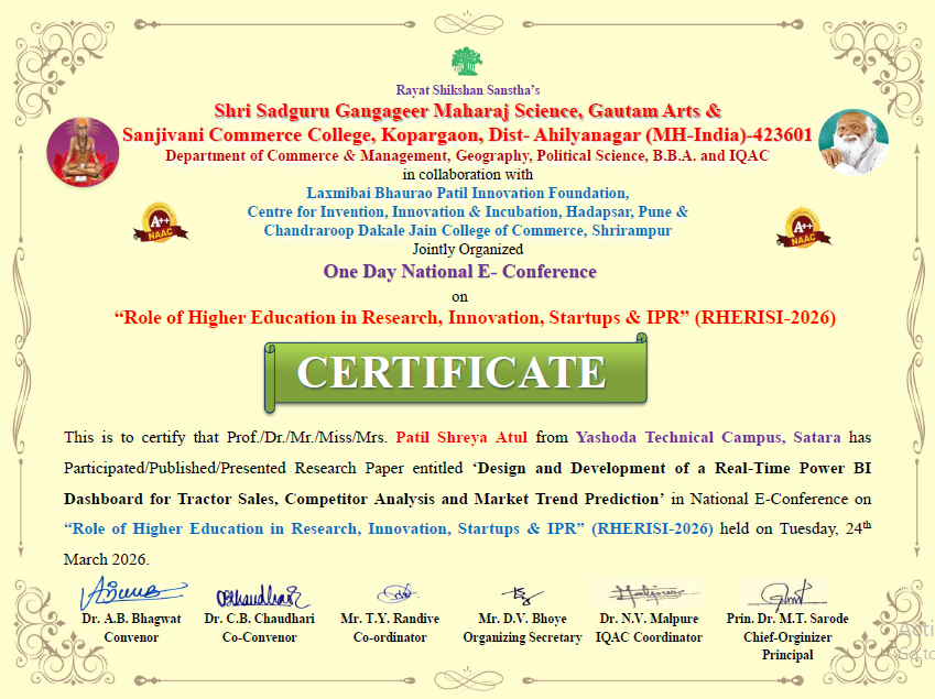 MBA II student presented Research paper at National Conference on "Sustainable Development in Commerce & Management" Challenges and Opportunities" held on 25th February, 2025 at Savitribai Phule Mahila Mahavidyalai, Satara. The Research paper entitled with "Grievances Redressal Mechnism in AR Engg. And Innovations, Pvt. Ltd. Satara."