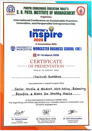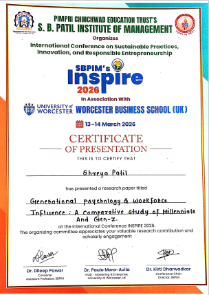 MBA II student presented Research paper at International Conference on "Innovation and Sustainability Reimaging and Repositioning (Business, Information Technology, Environment & Society)" held on 15th March, 2025 at Chhatrapati Shahu Institute of Business Eductaion and Research (CSIBER), Kolhapur. The Research paper entitled with "A study on Impact of Artificial Intelligence to enhance employee's efficiency with respect 91 Serif One Stop Solutions Pvt. Ltd., Pune"